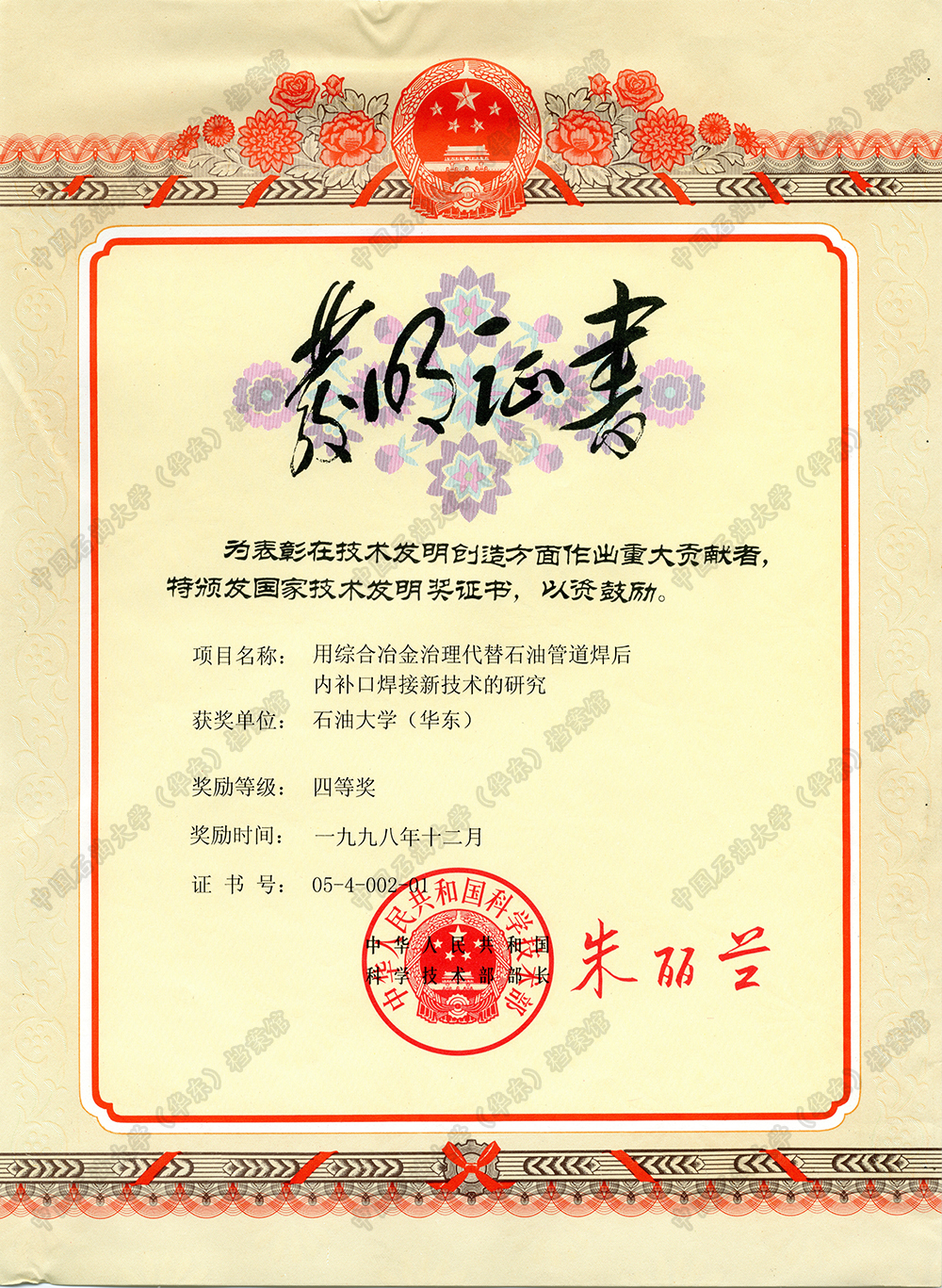 发明证书——用综合冶金治理代替石油管道焊后内补口焊接新技术的研究