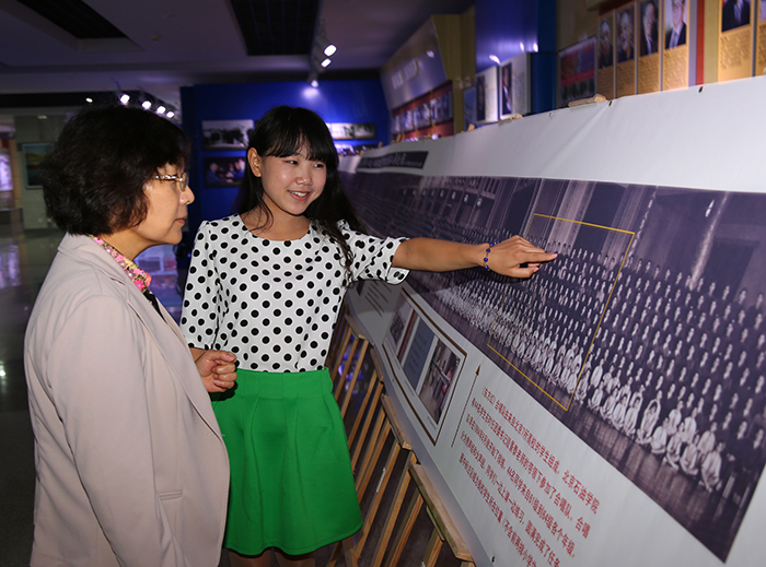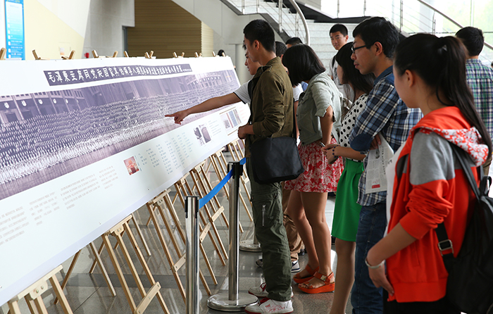 6月7-9日,在2014年国际档案日来临之际,档案馆带领大学生校史文化研究协会在图书馆一楼大厅扫描展出了这幅“毛泽东主席同党和国家其他领导人接见参加演出《东方红》的全体人员合影”,展示图由原图放大3倍制成,图片一次整体喷绘而成,总长度达10米。围绕巨幅图片,展示内容涉及到《东方红》的概况、简介、节目单和创作的历史背景,还有李桂珍老师珍藏的我校参演学生的合影照片、歌曲集以及周总理党课的入场券,并附图对如何拍摄这张巨幅照片进行了说明,图片对我校参加演出学生所在区域进行了特别标注和说明,现场大屏幕循环播放《东方红》音乐舞蹈史诗的电影。这次展出图文并茂,声影联动,力求让广大师生在声音、影像、图片和文字面前穿越时空,重新回味那段激情燃烧的岁月。