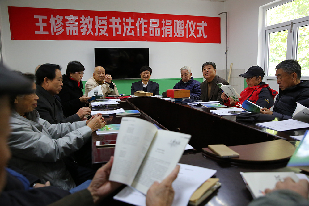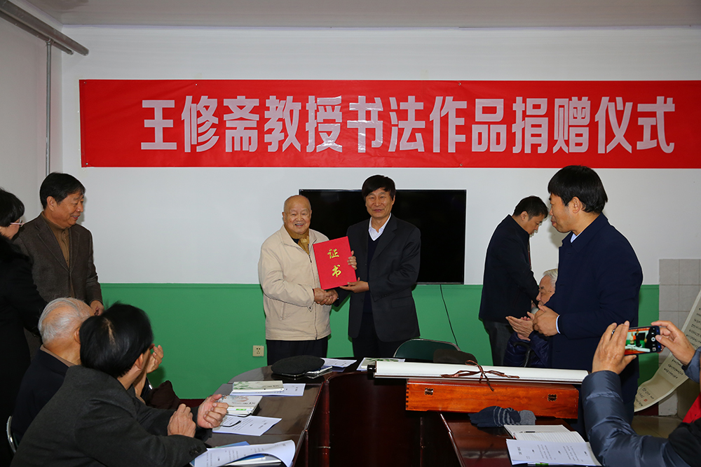 王瑞和副校长代表学校接收了捐赠并向王修斋教授颁发了捐赠证书。出席捐赠仪式的还有北京离退休办公室主任李国,437ccm·必赢国际老年书画社社长华泽澎,书画社部分成员和北京离退处部分离退休老同志。档案馆馆长牛庆玮主持了捐赠仪式。