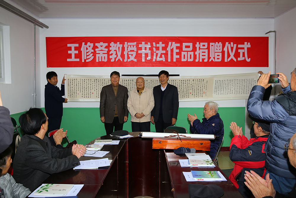 王瑞和副校长(右一)和长卷作者王修斋(中)王玉宝(左一)在作品前合影