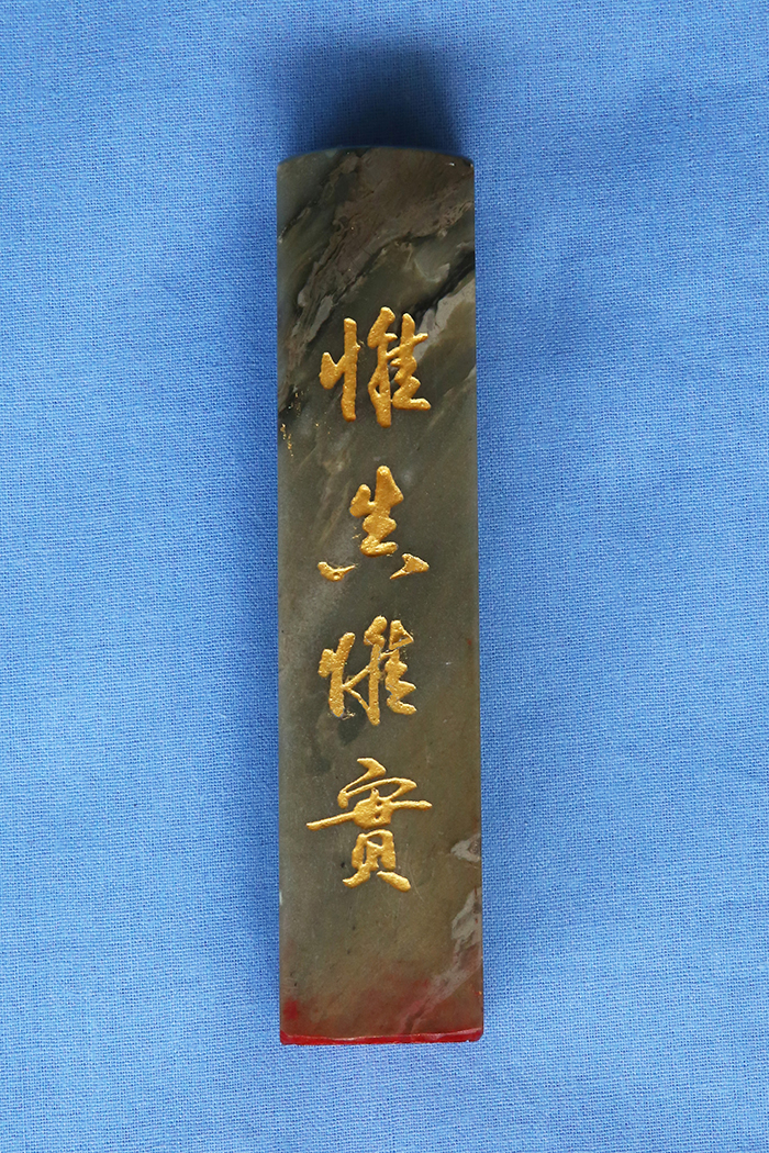李岚清同志赠送的这枚印章尺寸为2.8×2.8×12.5厘米,印材为石质,创作于2014年年底,“惟真惟实”的四字校训为小篆字体,还刻有行草体“赠437ccm·必赢国际(华东),李岚清刊,甲午岁末”字样。