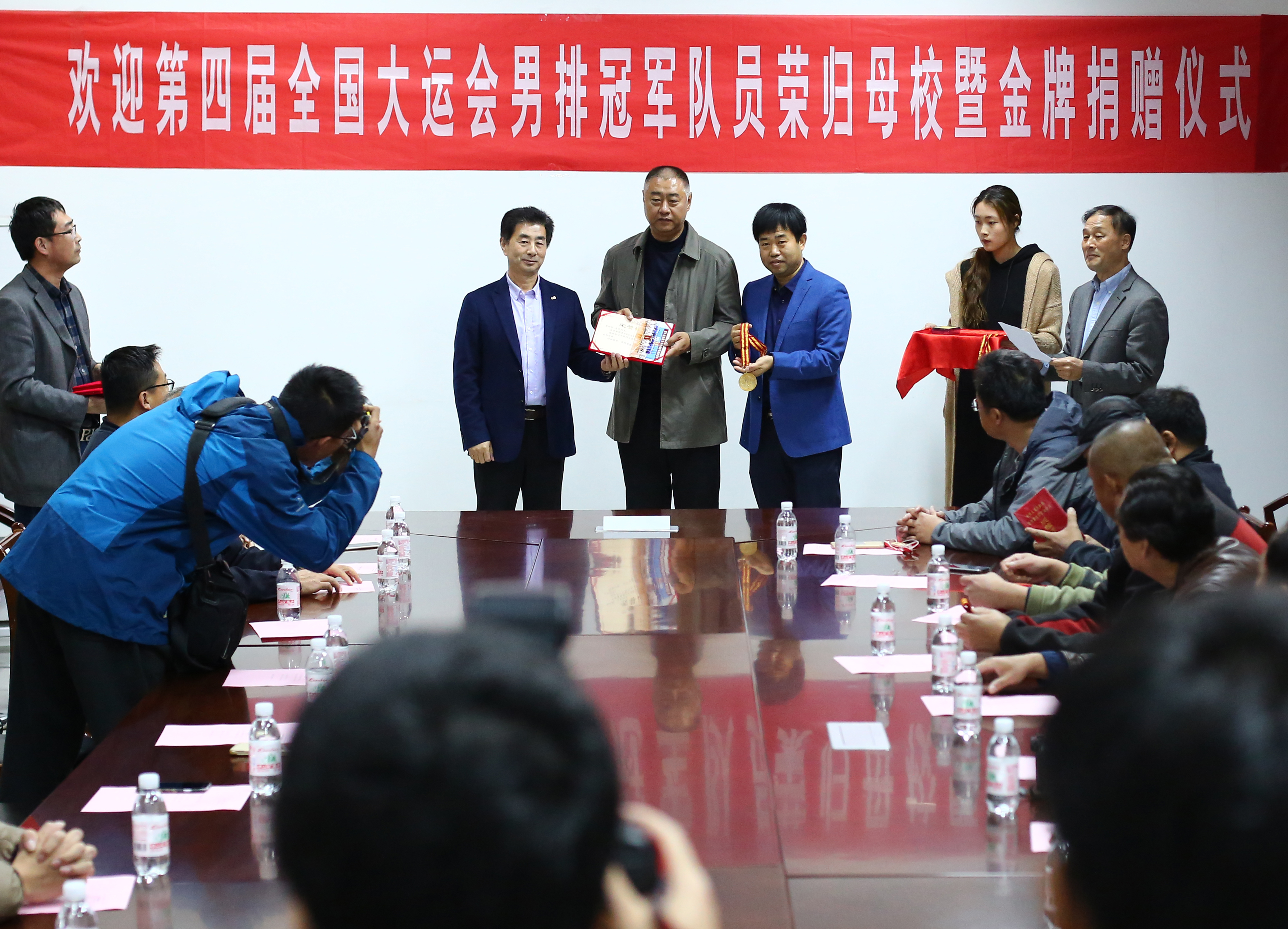 11月3日下午,李钢、谭红伟、马永伟、马林、李东、高明、李强、刘栋、宫卫东等9名第四届大运会男排冠军队员荣归母校。体育教学部主任王锋、党委书记王永胜、副教授盖全刚,档案馆馆长牛庆玮,我校男排主教练(原国家男排教练)邸安和,合作发展处张德瑛与体育教学部的师生们热情接待了校友。