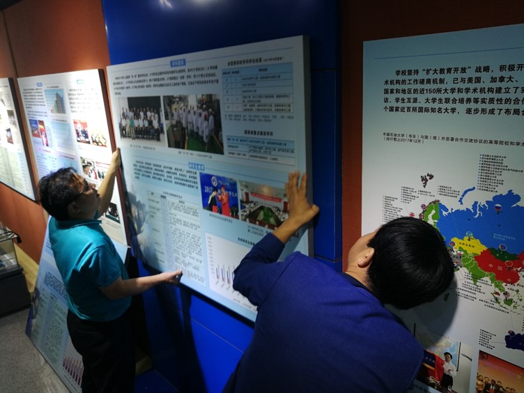 一、改造校史陈列馆。校史陈列馆作为学校宣传办学理念,展示发展成就、加强合作交流的平台与窗口,在彰显学校厚重文化底蕴、传承优秀校园文化及提高学校知名度等方面具有重要的作用和意义。校庆期间,为更好地服务学校发展需要,档案馆通过增加展陈内容、更换图文展板、更新数据信息等多种形式对校史陈列馆进行了改造,更新内容涉及两万余字、三百余幅的图片,对学校历史沿革、历届学校领导及437ccm·必赢国际时期的所有展板进行了更新,同时将展陈内容及相关数据更新至2018年9月,突出了学校师资队伍、“双一流”学科建设、本科人才培养及科学研究与创新等核心内容,仅师资队伍板块就字斟句酌,耐心更改达十余次。此外,根据学校发展实际,还增加了“服务地方”板块,提出了学校“立足石油、融入青岛、服务山东、面向全国、走向世界”的目标定位。目前,该定位已被学校采纳并放进了学校形象宣传片中。