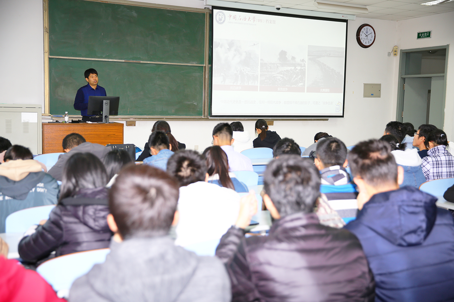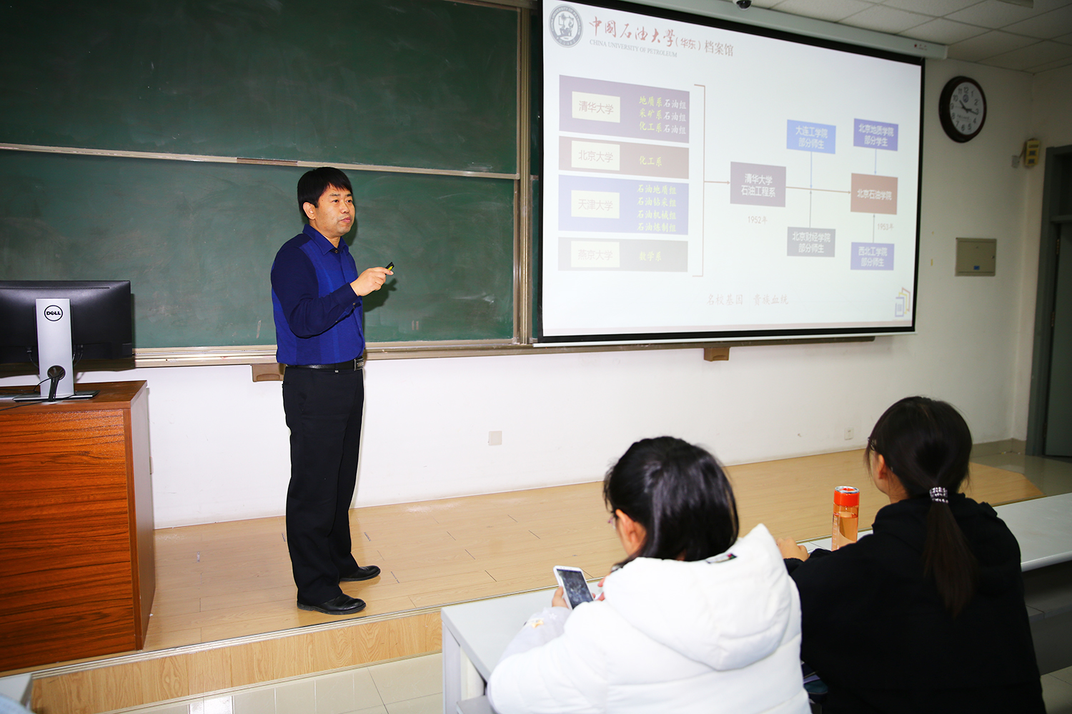作为新入学的石大学子,了解学校历史是每个人的必修课;传承发扬石大人追求卓越的精神,更是青年学子努力的方向。牛庆玮馆长从石油及其在国民经济中的重要地位谈起,向大家详细介绍了学校的发展历程。学校有着强大的“名校基因,贵族血统”,她融合了清华大学、北京大学、天津大学、燕京大学等多所名校的优秀人才。学校从1953年建校至今,三次更名、四次建校,风雨征程六十五载,路途艰辛,励精图治,弦歌不辍,稳步前行,探索并引领着石油高等教育的发展方向。