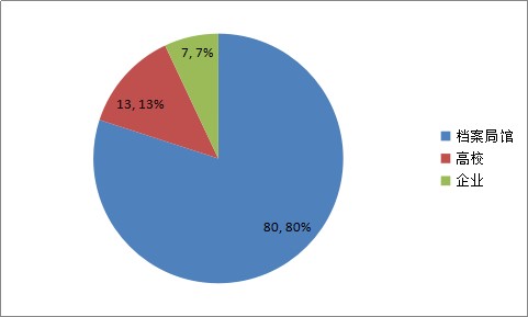 2018年度全国档案微信公众号年榜百强占比。进入全国百强的档案局馆类微信公众号共有80个,高校类微信公众号13个,企业类微信公众号7个。