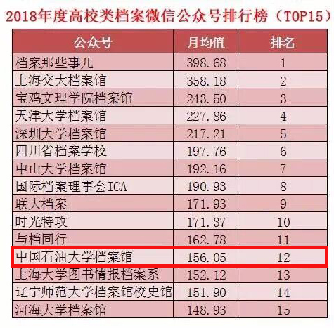 全国档案社交媒体联盟2015年由中国人民大学信息资源管理学院(档案学院)发起并成立,持续发布“全国档案微信榜单”,是档案宣传媒体社会影响力的权威发布。