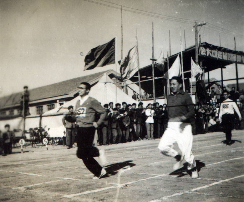 1957年10月19日,学院第四届运动会上曹本熹(右)参加百米比赛。