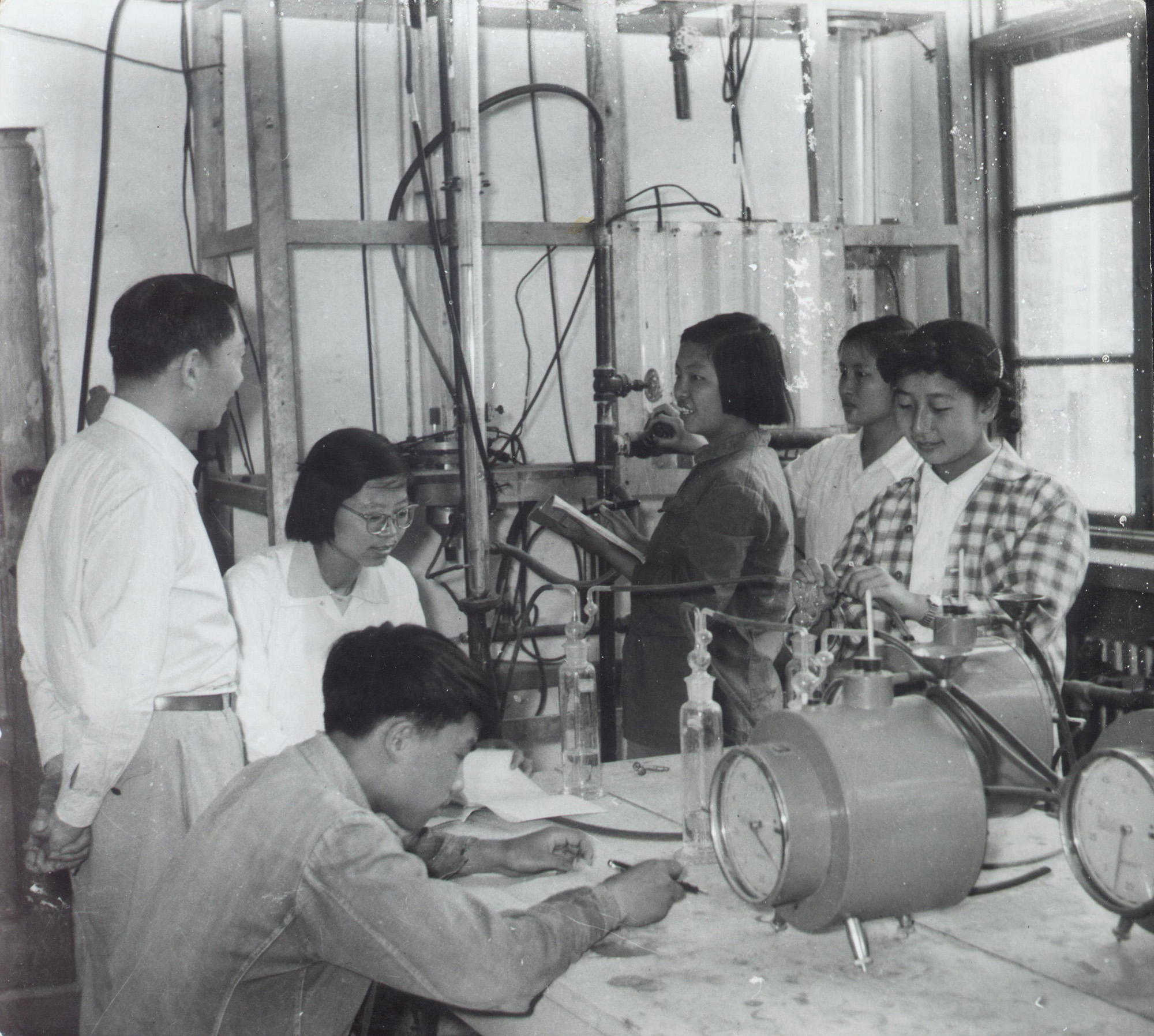 1958年夏,曹本熹与炼制系同学讨论实验问题(靠墙树立的木制实验架是曹本熹自己动手制作的)。