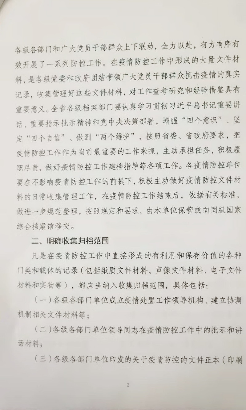 凡是在疫情防控工作中直接形成的有利用和保存价值的各门类和载体的记录(包括纸质文件材料、声像文件材料、电子文件材料和实物等),都应当纳入收集归档范围,具体包括: