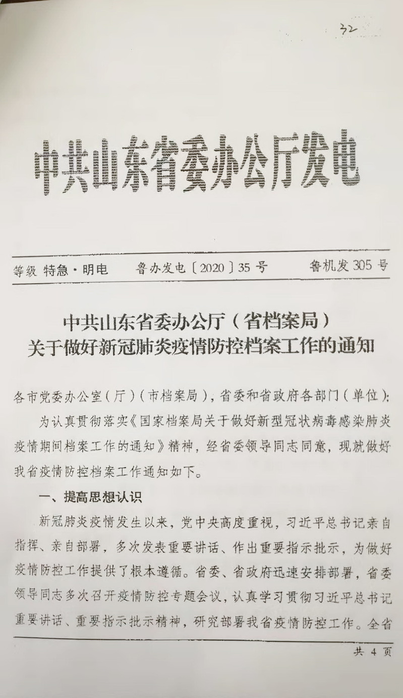 附:中共山东省委办公厅(省档案局)关于做好新冠肺炎疫情防控档案工作的通知