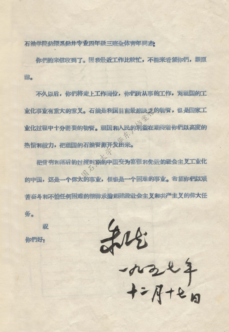 朱德副主席很快回信:不久以后,你们将走上工作岗位,你们所从事的工作,对祖国的工业化事业有重大的意义。石油是我国目前最感缺乏的物资,也是国家工业化过程中十分需要的物资。祖国和人民的利益在期待着你们以高度的热情和毅力,把祖国的石油资源开发出来。把贫穷和落后的过渡时期的中国变为富强和先进的社会主义工业化的中国,这是个伟大的事业,但也是一个困难的事业。希望你们以艰苦奋斗和不怕任何困难的精神承担起建设社会主义和共产主义的伟大任务。