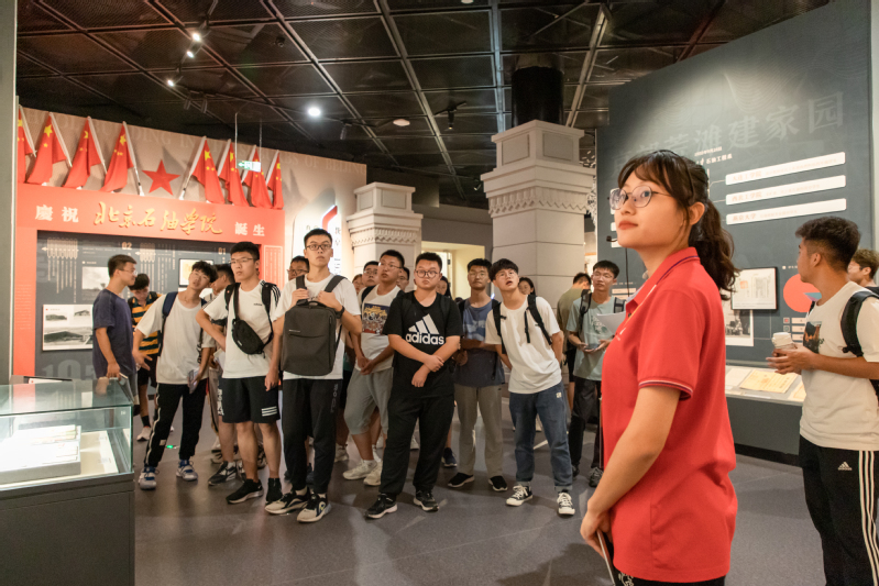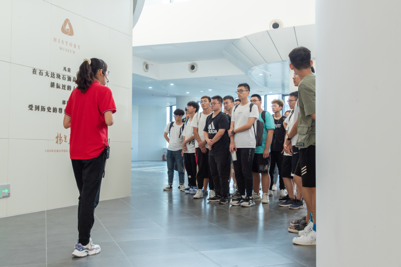 站在历史角度重新认识了如今的石大,新生们心中自豪感油然而生。校史馆中,面对建校时期的图片资料,听到石大曾被戏称为“泥浆学院”时,幽默诙谐的语言中透着辛酸。从筚路蓝缕的建校之路到如今的煌煌上庠,从北京石油学院简陋的“九间房”校舍到如今的古镇口校区,讲解员的讲解将石大精神具象化,深深植入了每一位新生心中。敬佩认真的神情、不约而同按下的快门,也体现了2021级海空学院新生传承石大精神的决心。