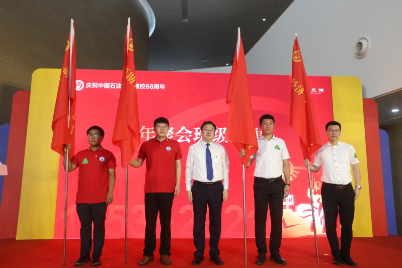 万云波宣读校友之星表彰文件,张玲玲、操应长为秩年聚会的班级授旗。现场播放校友之星获得者们表达对母校感激与祝福之情的视频资料。视频中,他们激励更多石大人奋发图强。