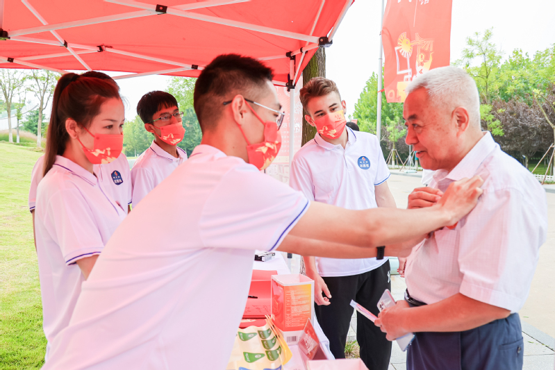 志愿者为来宾佩戴胸贴