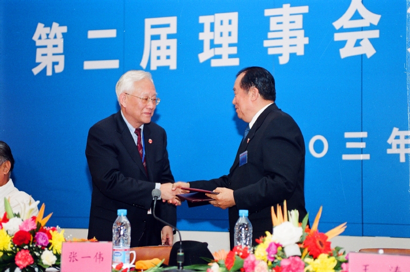 1993年10月,在王涛总经理倡议下,三大公司成立石油大学理事会,张一伟担任第一届理事长。图为2003年10月,王涛向第二届理事长张一伟表示祝贺。