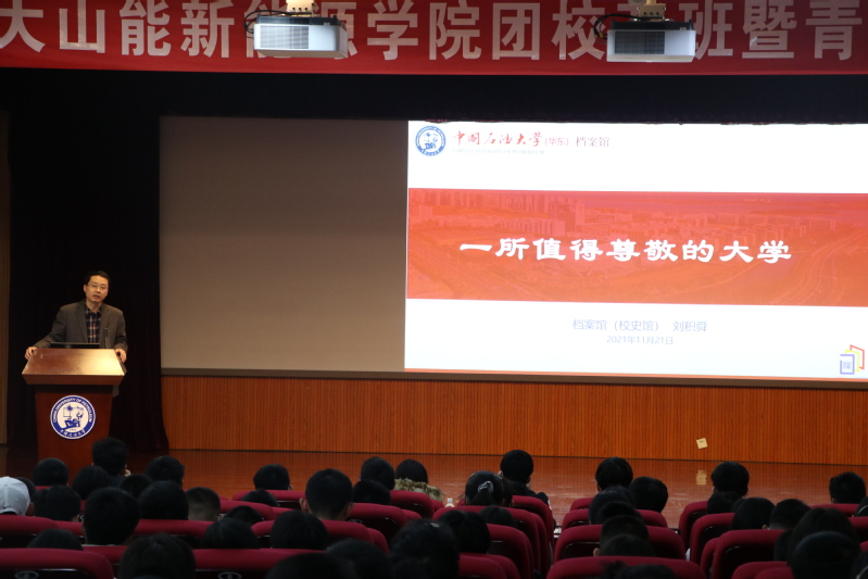 11月21日下午,新能源学院于逸夫礼堂举办团校开班暨青年健身节颁奖仪式,档案馆馆长刘积舜受邀做《一所值得尊敬的大学》主题团课。