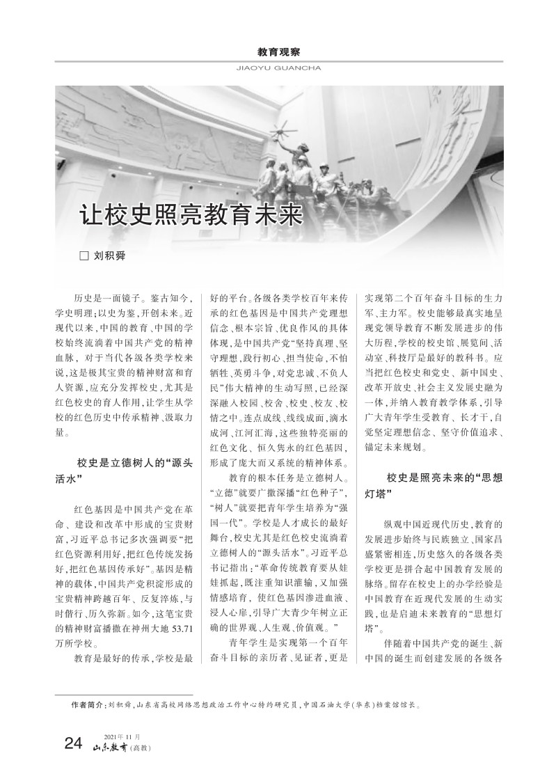 近日,《山东教育》杂志刊发档案馆馆长刘积舜文章“让校史照亮教育未来”,全文如下: