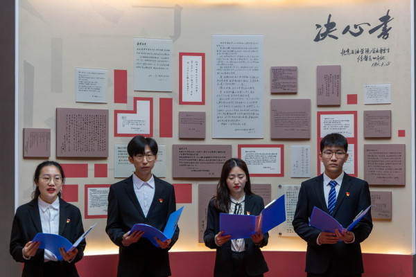 时间仿佛又回到了那个书写决心书的年代,展墙前,八名党员身姿笔挺,胸前鲜艳的党徽格外耀眼,他们声情并茂地朗诵起决心书所写,“祖国的需要就是我唯一的志愿,祖国需要我到哪里我就到哪里。”字字铿锵,声音久久在校史馆中回荡。