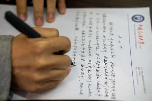 系列活动后,党支部成员心潮澎湃,纷纷拿起纸笔写下个人决心书。他们一笔一划,铿锵有力,字字坚决,用文字抒发想要立刻投身祖国石油事业的一腔热血。化学工程与技术专业博2101班王飞正在参与Ni/SAPO-11临氢异构化催化剂的合成及其性能研究课题,这对于优化我国汽油池组分,生产高质量燃料油、润滑油具有十分重要意义,他在决心书中写到:“作为一名化工专业博士生,在今后的学习与工作中将牢记祖国能源事业的目标,为祖国石化行业的发展贡献自己的智慧和力量!”
