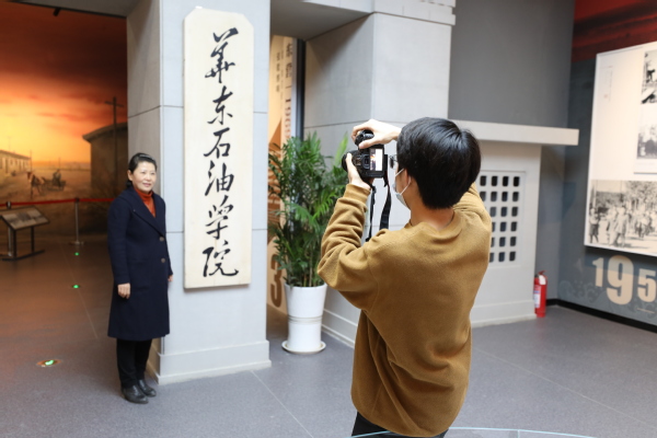 老师们分批走进校史馆中,大家有说有笑、三三两两的在校史馆中找寻自己中意的校史文化背景,在一幕幕展墙前拍下一张张满意的照片。拍摄之余,老师们纷纷要求要到华东石油学院校门、石油大学校门、荟萃湖等场景还原处多拍一些照片留念,大家纷纷表示通过这些场景还原拍摄的照片,有一种跨时空交流的感觉,仿佛又回到了当年在东营老校区求学和工作时候的场景,欣喜万分。