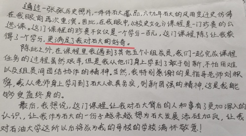 选课大学生表示,通过该课程不仅对石大有了全新的认识,同时在课程中锻炼了合作意识、表达能力,还收获了自信和友谊,更重要的是对石大的热爱才刚刚开始。