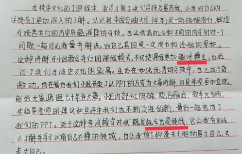 此次改革得到了同学们的广泛支持和积极配合,结课答辩现场胜似一场校史文化的盛宴,各个小组精心准备,汇报形式丰富多彩,开展了视频制作、微信推文、论文写作、演讲展示等诸多方式;汇报内容精彩纷呈,青年学生多视角对石大历史、历史名人、石大文化、大学精神等进行了多方面的挖掘;汇报现场气氛热烈紧张,课程组全体老师和学生小组长作为评委秉持公正公开,对每一小组认真打分;汇报结果超出预期,涌现出现了一批亮点、精品作业。