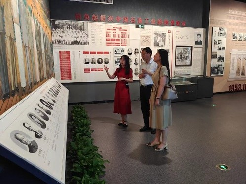 廖洋对我校近70年的发展历程表现出极大兴趣,不时驻足观看。在北京石油学院时期,廖洋了解了新中国第一批石油科技和石油教育工作者的事迹和成就,在巨幅油画《大义归来》、“成龙配套、援建油校”展板前,廖洋对我校艰苦奋斗的历程与勇担历史使命的精神表示敬佩。