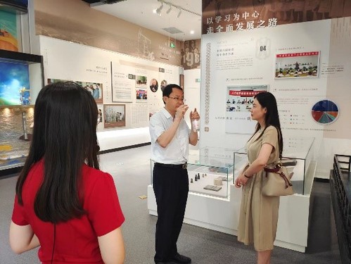 7月11日,《中国科学报》山东记者站站长廖洋在档案馆馆长刘积舜的陪同下,就石油科教、校史上的科学家及科学家精神等选题在校史馆参观采访。校史宣讲团成员、化学化工学院2021级博士生商敬媛负责讲解。