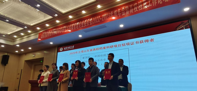 会议并为从事档案工作20年、30年人员颁发荣誉证书,为山东省高校档案8个科研项目颁发结项证书,我校由靳国栋主持的《基于内容的照片档案标注与检索利用研究》、张爱新主持的《基于老科学家学术成长发展规律凝聚与弘扬新时代科学家精神》、张玮主持的《传承+智慧:高校档案工作中的自信元素研究》、秦莹莹主持的《口述历史视阈下高校名人档案建设范式研究》、刘洋主持的《基于用户满意度视角的高校档案服务策略研究》等5项课题全部通过结题评审。