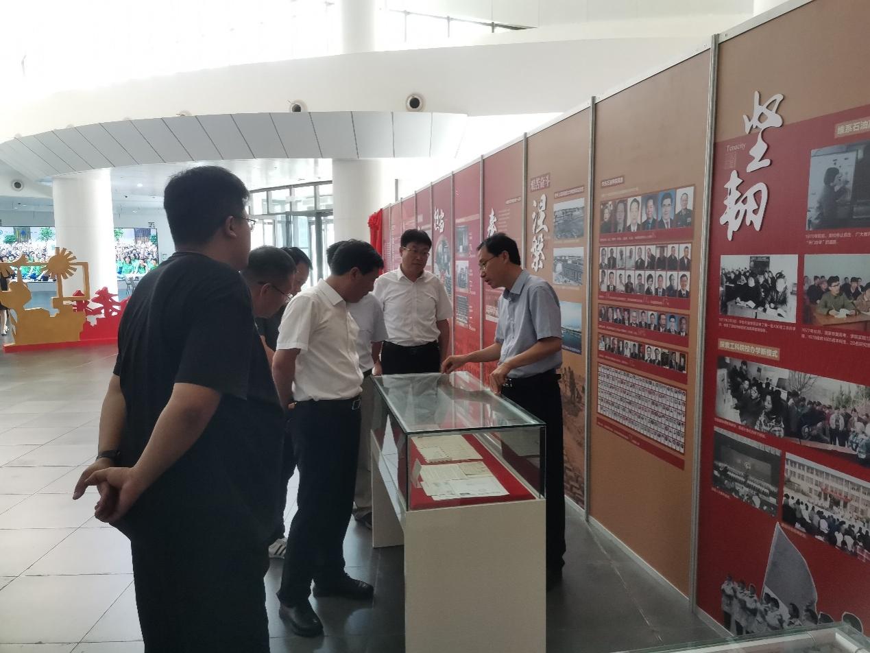 调研期间,相关领导还参观了“从历史走向未来”——庆祝建校70周年“档案见证精神”图文实物展,展览分前言、思想光辉、家国同心、艰苦奋斗、惟真惟实、追求卓越、后记等板块,首次展出了文史专家余世诚给戈尔巴乔夫的信,还原“南陈北李”建党牵线人杨明斋事迹季塔连科的回信,石大人参加石油大会战的历史瞬间等珍贵档案资料。这些档案资料见证了70年来石大人“为祖国加油、为民族争气”的报国信念,蕴含了“家国同心、艰苦奋斗、惟真惟实、追求卓越”的石大精神。档案馆馆长刘积舜陪同参观并进行了讲解。