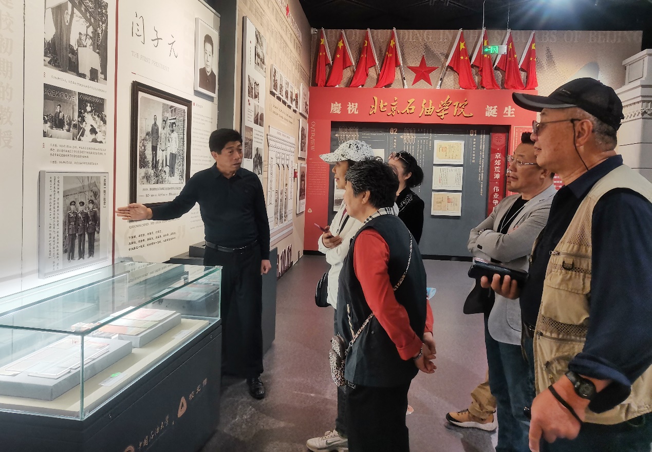 在校史馆,靳国栋详细讲解了学校70年发展历程。闫胜利、闫丽娜等仔细观看每一块展板、并讲述了照片背后的故事。在闫子元专题展板前,闫胜利、闫丽娜共同回忆了在北京石油学院那段时光,并讲述了闫子元参加革命的经历以及在北京石油学院时期工作和生活的场景。参观结束后,一家人在闫子元专题展板和主雕塑前合影留念,盛赞校史馆全面生动记录了学校的发展历程,称赞学校没有忘记为学校发展作出贡献老同志的做法很暖心,对学校尊重历史、不忘初心,大力开展校史教育的做法给予高度评价,称赞一代代石大人不畏艰辛,为国家作出了应有贡献。