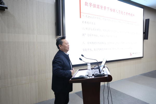 中国高等教育学会档案工作分会副理事长、山东大学档案馆原馆长兼校史办公室主任、山东大学历史文化学院教授赵爱国作题为《数字强国背景下档案人员的能力与素养提升》专题报告。