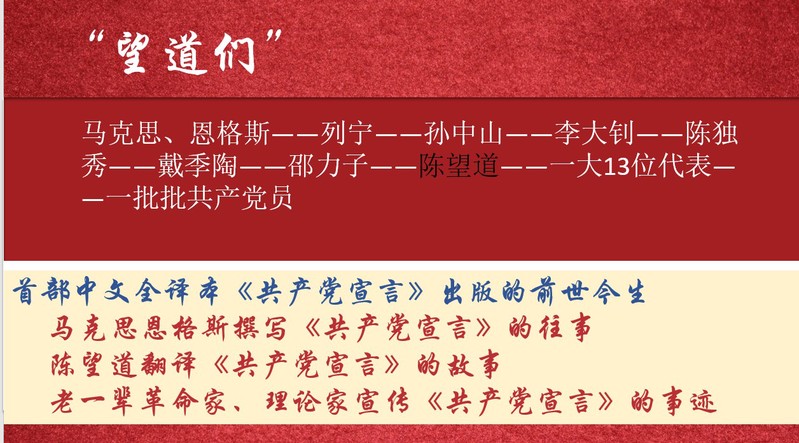 1.如果《共产党宣言》不是陈望道翻译的,书名还能不能叫望道?初看书名《望道》,以为是一本写陈望道先生的文学传记。读后才令人恍然大悟,书中刻画的不仅是一位望道,而且是一群包括陈望道在内的,寻找真理之道、践行真理之道的“望道们”。包括:马克思、恩格斯——列宁——孙中山——李大钊——陈独秀——戴季陶——邵力子——陈望道——一大13位代表——一批批共产党员。