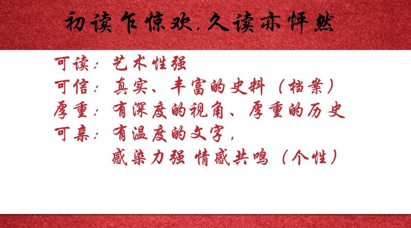 不说教,不枯燥、可读。作品视野开阔,文学性、艺术性强:文字流畅简洁大气,有吸引人的故事,许多章节仿佛身临其中,时不时被触动灵魂。读的过程心潮澎湃,一点不累,润物无声,感染力强,让红色文化直抵人心。