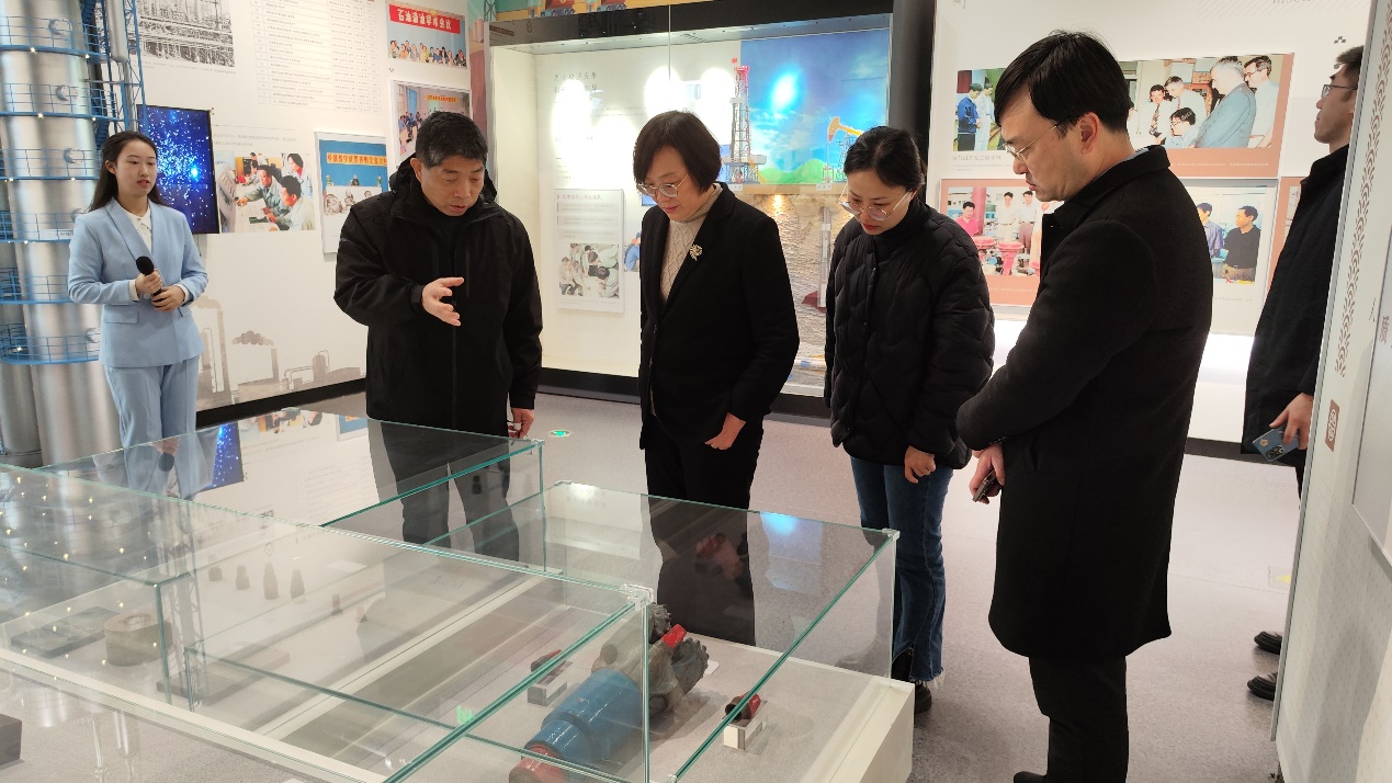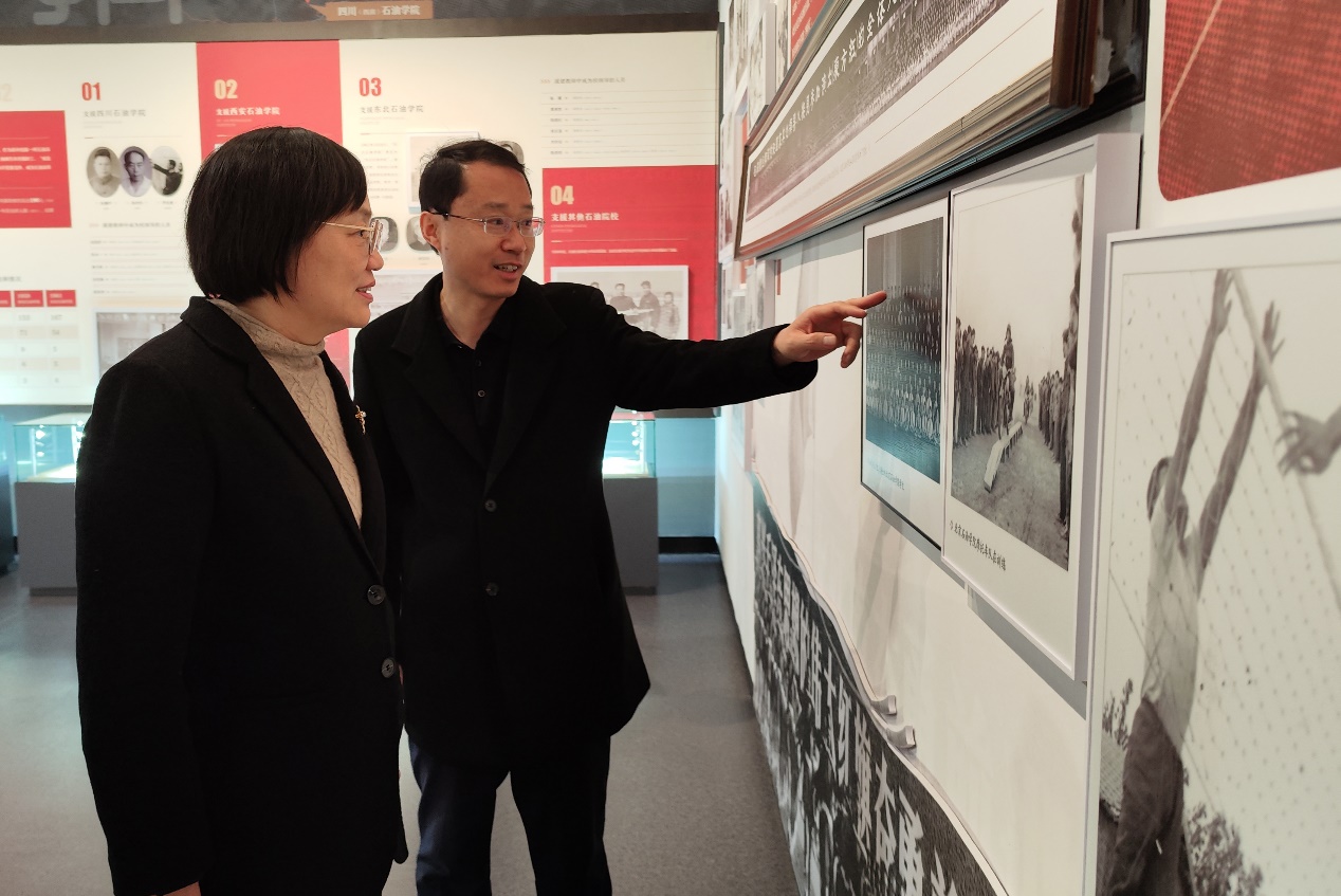 陈玉娟一行在我校档案馆馆长刘积舜,档案馆副馆长、校史馆馆长靳国栋陪同下实地调研了校史馆,双方就校史馆建设的宏观思路、展厅布局、文化元素呈现、历史文化资源数字平台建设等方面进行交流探讨。刘积舜还结合校史馆中的展陈与实物资料向陈玉娟一行讲述我校师生参加石油会战、援建石油高校等重大校史故事的挖掘与研究过程,并介绍了校史馆在场景复原、数字媒体应用方面的特色与特点。