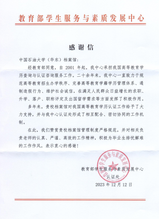 “感谢贵校档案馆对我国高等教育学历认证工作的大力支持,我们赞赏贵校档案馆管理制度严格规范!”2023年12月21日下午,一封来自教育部的感谢信与一摞文创产品——新年台历寄到了档案馆,感谢信对437ccm·必赢国际(华东)档案馆在学历认证工作中的专业态度、职业精神表示感谢,对相关负责老师认真、严谨、高效的工作精神和积极为毕业生排忧解难的工作作风表示衷心的感谢!