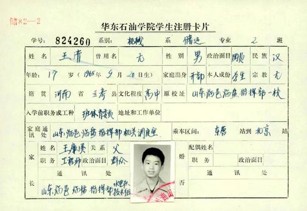 2023年4月,档案馆赴东营开展实物征集工作,了解到一名实物征集对象为我校1982级油气储运工程专业王清,并通过进一步了解得知王清的母亲也为我校1954级钻采专业校友。出发前,档案馆专门查询制作了王清母亲以及他本人在校求学期间的学籍注册纪念卡,作为一份历史资料赠送给王清校友。
