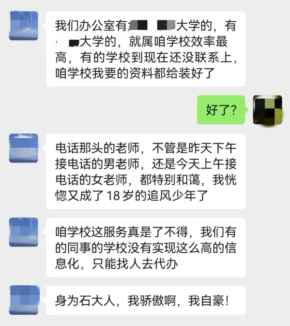 “身为石大人,我骄傲啊,我自豪!”不久前,在烟台工作的我校2002级孙校友,给学校发来了充满感激的微信留言。原来,因工作需要,她急需高考新生录取花名册。抱着试试看的态度,她致电学校档案馆,工作人员详细询问了她的利用需求,因为档案数字化、信息化建设的扎实基础,迅速在档案管理系统中找到了她所需的材料,并打印、盖章后邮寄给她,解决了她的燃眉之急。她收到材料后,对学校高效、优质服务表示感激,赞扬学校档案数字化和信息化程度之高。