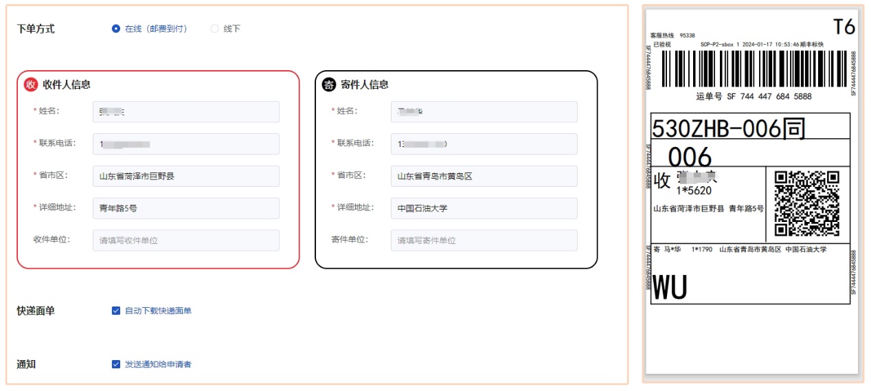 系统实现在顺丰快递对接,可在线直接下单