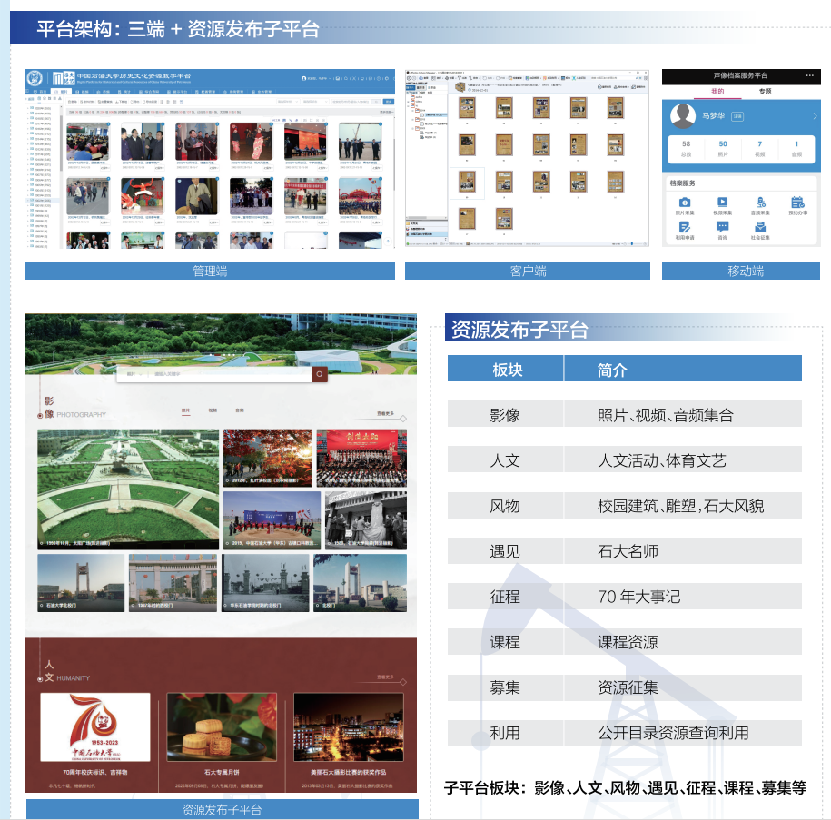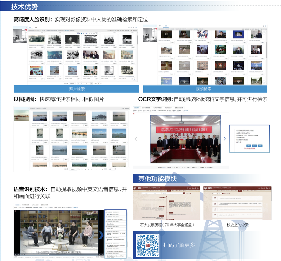 对于声像档案,完成全部历史录像带的数字化转录,3800盘尘封的磁带变成鲜活的影像,在此过程中细化形成石大声像档案分类方案,涵盖党团工会、校情校务、学科学术、教务教学、外事交流、文艺体育、石大人物、石大风物、毕业照、典礼校庆等11个门类,在此基础上,实现了学校70年声像档案资源的大统一管理,汇集照片14万张、视频1万余部,形成了宝贵的石大记忆资源库。