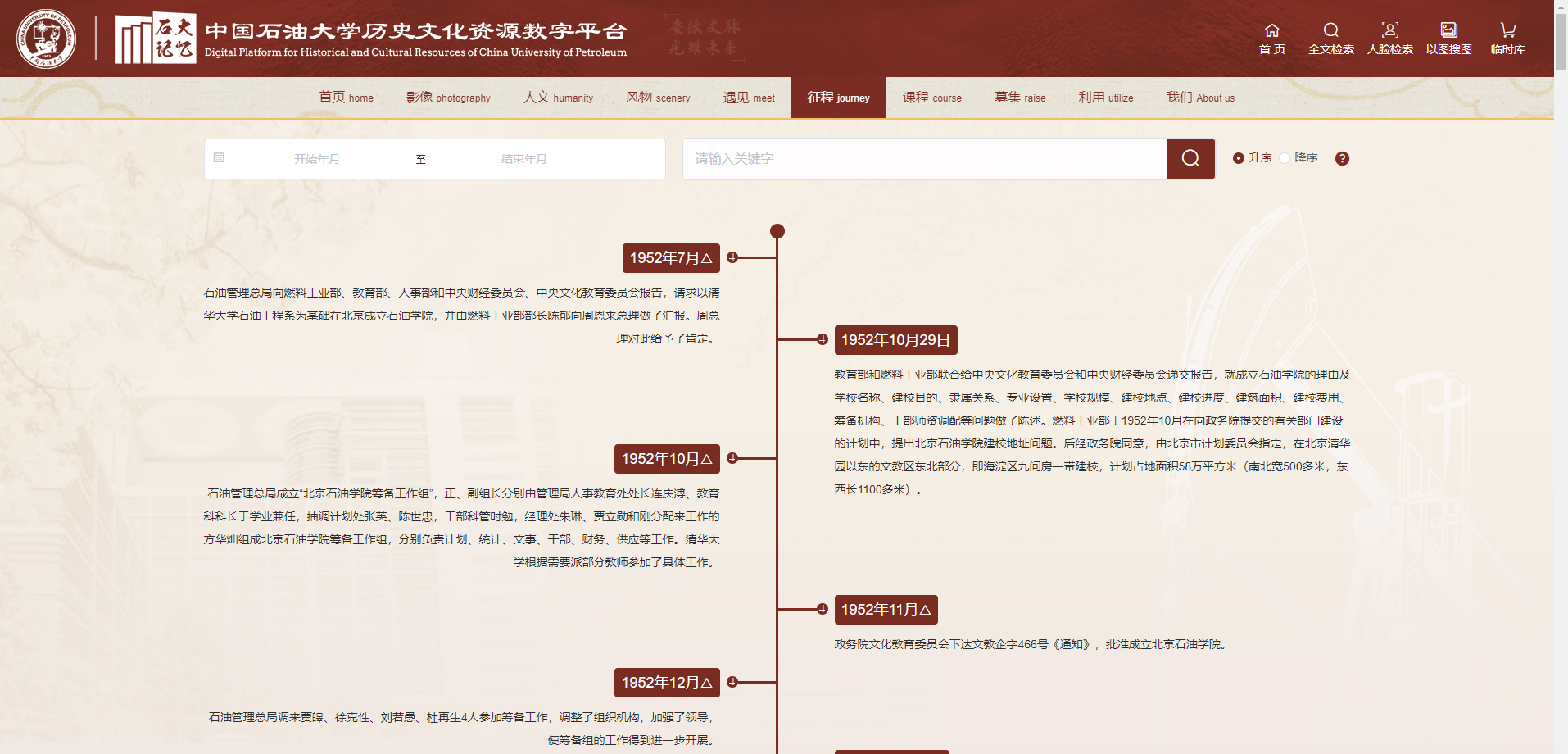 平台同时涵盖了总字数近90万的学校70年的发展大事,并以图形化方式进行展示,实现了学校重要事件的一网通查。