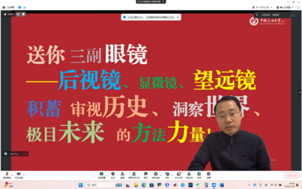 讲座最后,刘积舜结合讲座内容谈了几点期望。希望大家用“后视镜”审视石大七十年的历史和自己过去的人生,用“显微镜”发掘历史长河中更多的故事和精神积淀、洞察世界和人生,用“望远镜”看到更远的未来。他希望同学们思考三个问题:你要到哪里去?成为什么样的自己?脚下的路该如何走?在思考的基础上做好路径规划图,向着目标不断努力,成就更加优秀的自己。