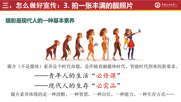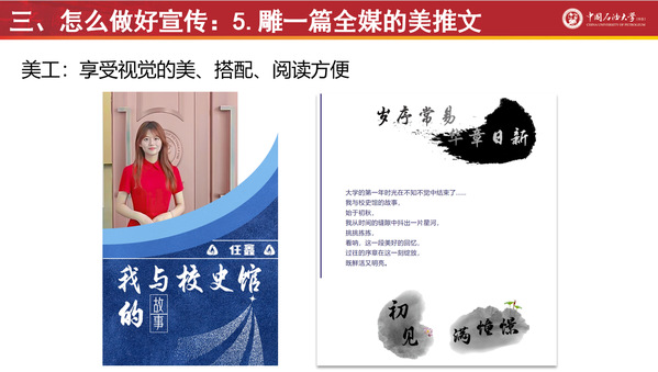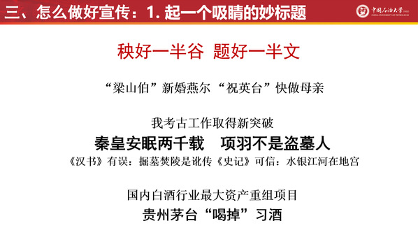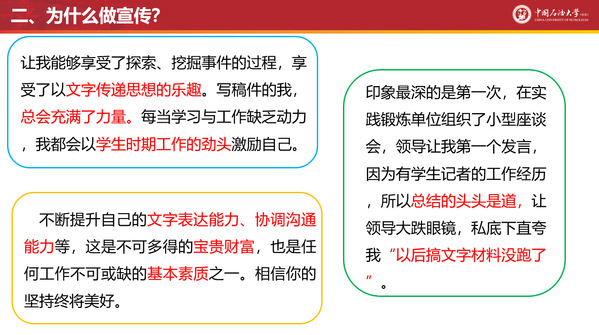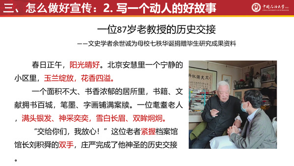 刘积舜以2005级大学生记者团团长翟广忠撰写的《石大简史:一所国字头大学的70年风雨路》及多篇深度好文为引,通过展示文字宣传能力在职业生涯发展中的长久必要性等,从责任、宣传的力量、成长成才的必由之路三个角度详细讲述了为什么做宣传。他表示语言表达、沟通、待人接物是全面发展人才必备的能力,为此要不断提升宣传与写作的能力。