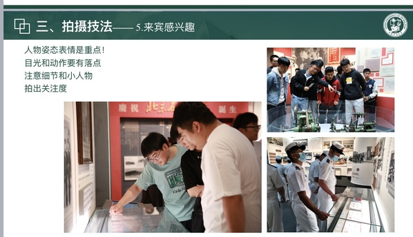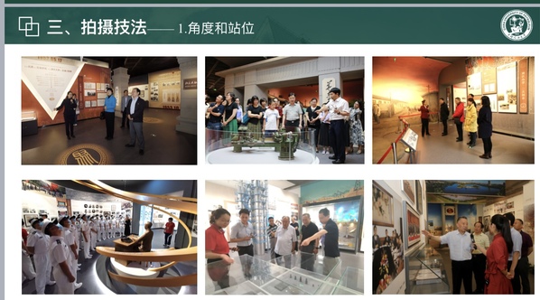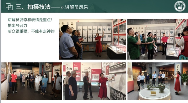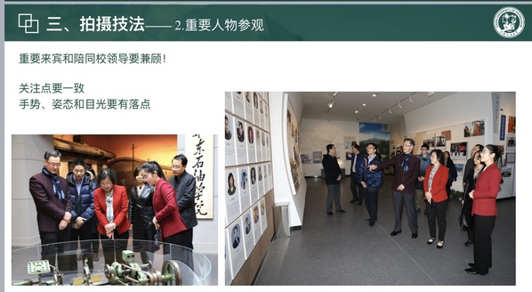 围绕具体拍摄技法,靳国栋先诠释了拍摄时角度和站位的重要性,再分别从“重要人物参观”、“日常参观留念”、“开展主题活动”、“来宾感兴趣”、“讲解员风采”、“合影”六个不同的照片属性给出了相应的拍照要求,说明相机拍摄的重点以及将拍摄目的体现在画面上的重要性和方法。他进一步结合馆内参观经典站位及典型照片,对六种属性拍摄均给予了详细的解释,通过提问与互动探讨,详细向大家分享了关于“如何拍摄校史馆参观”的宝贵经验。