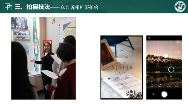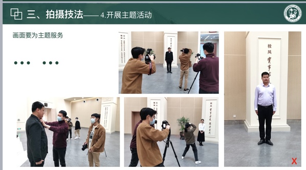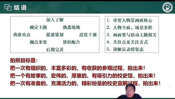 靳国栋根据拍摄类别进一步分析列举了五项拍摄主体,总结出拍摄校史馆参观活动的五项画面重点,并给出六个参观照片实例,以与同学们交流互动的方式来分析每张照片如何对应拍摄主题,详细解释了画面表达重点的道理,回答了关于“校史馆参观拍照拍什么”的问题。