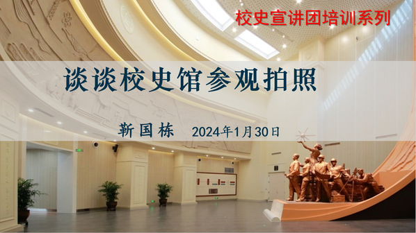 最后,靳国栋总结了拍好一张照片的九个步骤,给出了校史馆参观拍照的拍照目标,他希望大家:能把一次有组织的、丰富多彩的、有收获的参观过程,拍出来!把一个有故事的、宏伟的、厚重的、有吸引力的校史馆,拍出来!把一次有准备的、充满活力的、精彩纷呈的校史宣讲过程,拍出来!同时,靳国栋还表达了对同学们在日后拍摄中不断进步的殷切期盼,并祝福大家新年快乐。