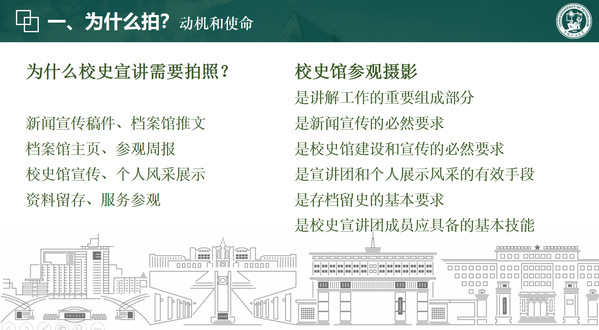 讲座伊始,靳国栋从参观性质以及相对应的拍摄类别出发,全面、细致地阐述了需要对校史馆参观进行拍照摄影的原因,鼓励宣讲团的成员们用镜头来重点记录校史馆宏伟的样貌以及讲解员卓越的风采。