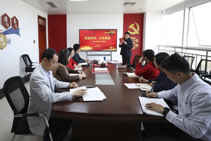 在主题党课环节,靳国栋以《经国序民 正其制度——“共产党员制度必读”读后感》为题,为党员们上了一堂生动的党课。他从制度属性:中国特色社会主义制度的属性;制度选择: 只有社会主义制度适用于中国;制度设计: 弘扬中国制度的坚实根脉优势;制度结构: 打造具有中国特色的制度链;制度体系: 构筑中国特色的制度大厦;执行制度: 决定制度生命力的执行体系等6个方面,系统讲授了中国特色社会主义制度的优越性和重要性。