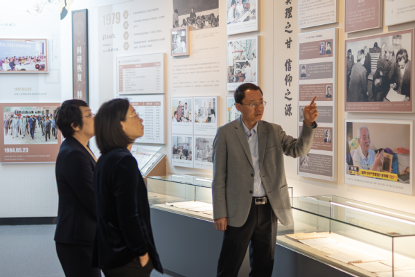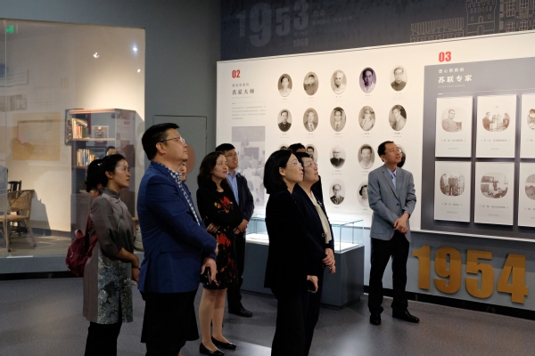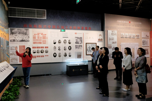 座谈会后,杨爱华一行在张玲玲、刘积舜、档案馆副馆长兼校史馆馆长靳国栋、校史研究部主任马梦华、综合管理部主任张大宇等陪同下实地参观校史馆,双方就校史馆建设的规划设计、参展布局、内容呈现、文化特色和情感共鸣等方面进行了深入交流和探讨。刘积舜还结合展陈内容和实物档案向杨爱华一行讲述了我校师生参加石油会战、援建石油高校、第一本共产党宣言以及杨明斋有关研究资料收集等背后的故事。