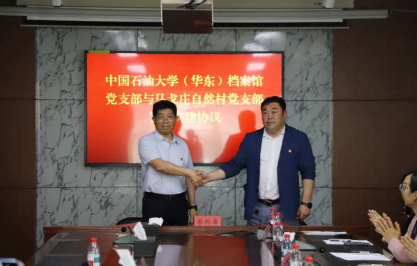 档案馆党支部书记靳国栋,平度市明村镇马戈庄网格党支部支部书记孙刚成分别代表双方支部签署党支部共建协议,共同推动开展杨明斋研究有关工作。